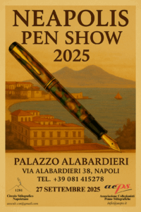 L’Associazione Collezionisti Penne Stilografiche (ACPS) e l’Associazione Culturale Circolo Stilografico Napoletano sono lieti di annunciare il Neapolis Pen Show 2025, con la sesta edizione della Mostra Scambio di Penne Stilografiche e Materiale da Scrittura di Napoli che si terrà sabato 27 settembre 2025 presso l’Hotel Palazzo Alabardieri, in via Alabardieri n.9, a pochi passi da Piazza dei Martiri, con orario 10:30 – 17:30. L’hotel si può raggiungere dalla stazione ferroviaria di Napoli Centrale, prendendo il bus n. 151 e scendendo al capolinea di piazza Vittoria da cui l’albergo dista circa un centinaio di metri salendo per via Calabritto.